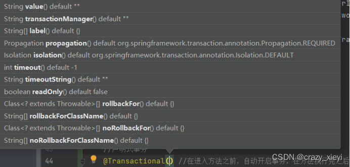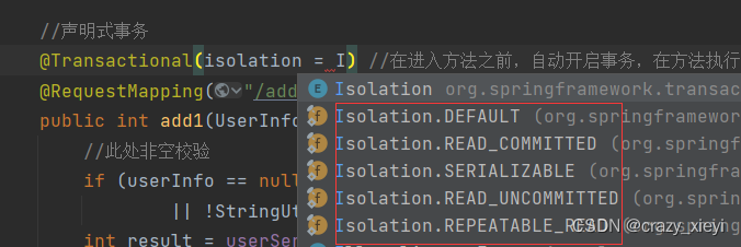 @Transactional(isolation = Isolation.DEFAULT) //在进入方法之前,自动开启事务,在方法执行完之后,自动提交事务,如果出现异常则自动回滚