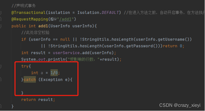 解决方案1:暴力解决,将异常重新又抛出去,这个时候声明式事务感知到异常了,会进行自动回滚操作: