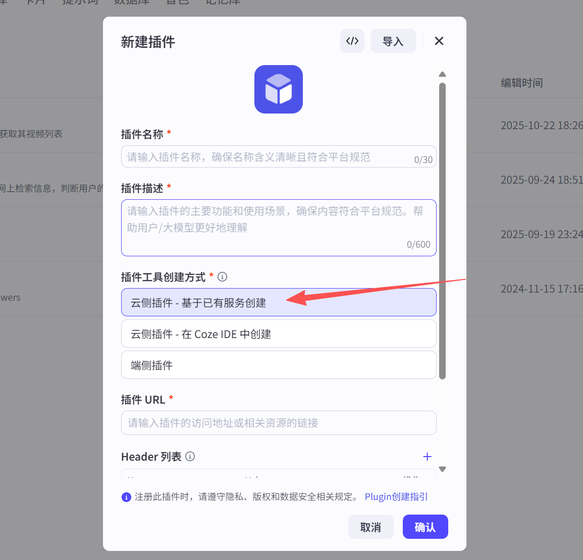 2.插件的名字和备注自己写就可以,插件工具的创建方式我们选择基于已有服务器创建。