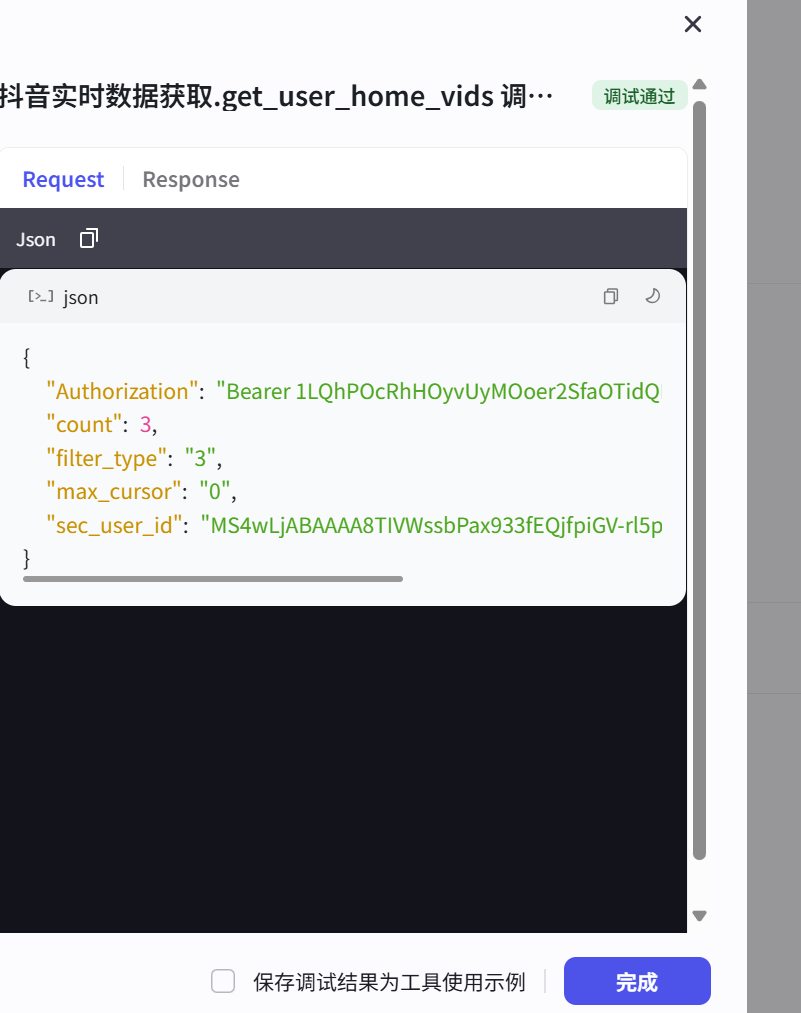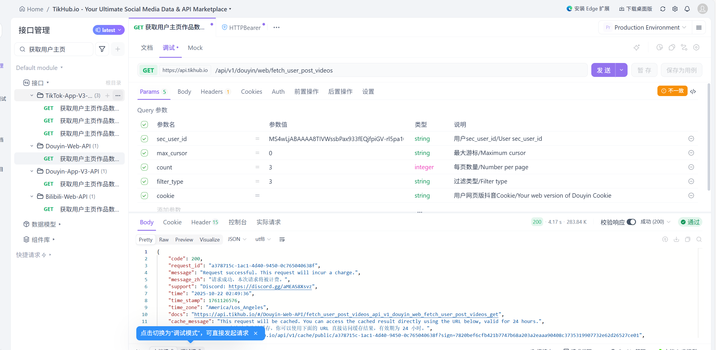 PS:我们也可以直接在tikhub上试运行,直接选择文档旁边的调试。选择下方返回结果就可以下载内容了。