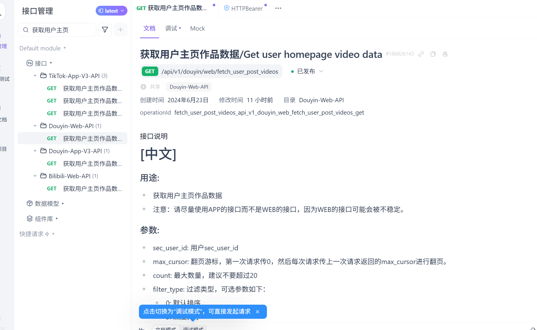 6.接下来我们在tikhub中找到我们想要的工具,在搜索栏中搜索获取用户主页数据,找到以下页面。