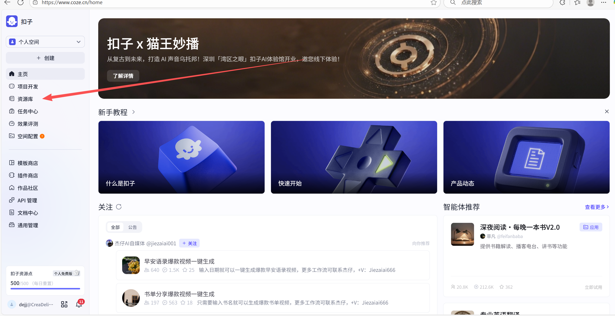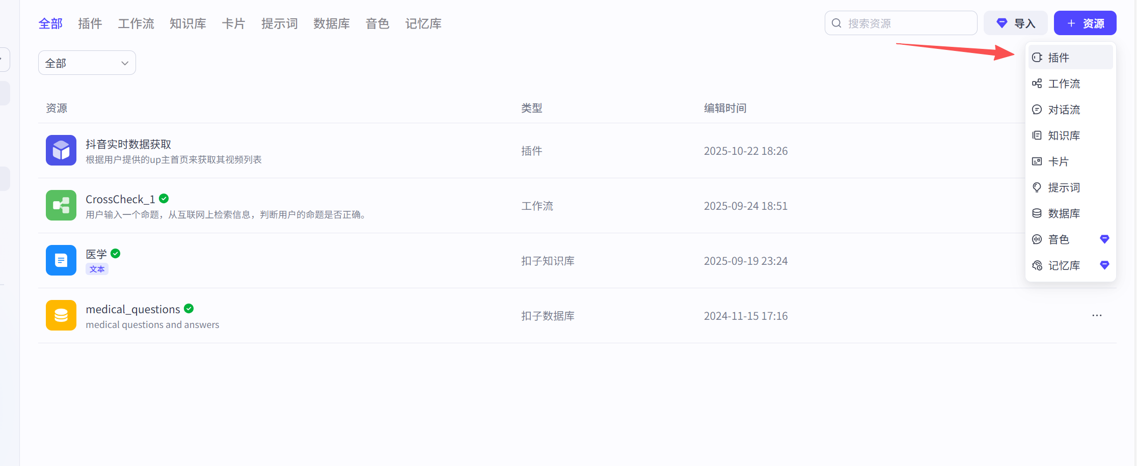 我们在coze平台的工作空间中,选择资源库开始我们的操作。