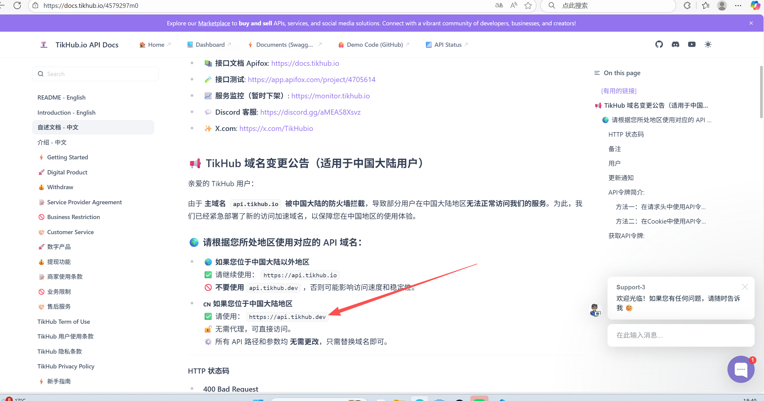 4.点开自述文档,下滑找到tikhub的域名复制黏贴在上方即可