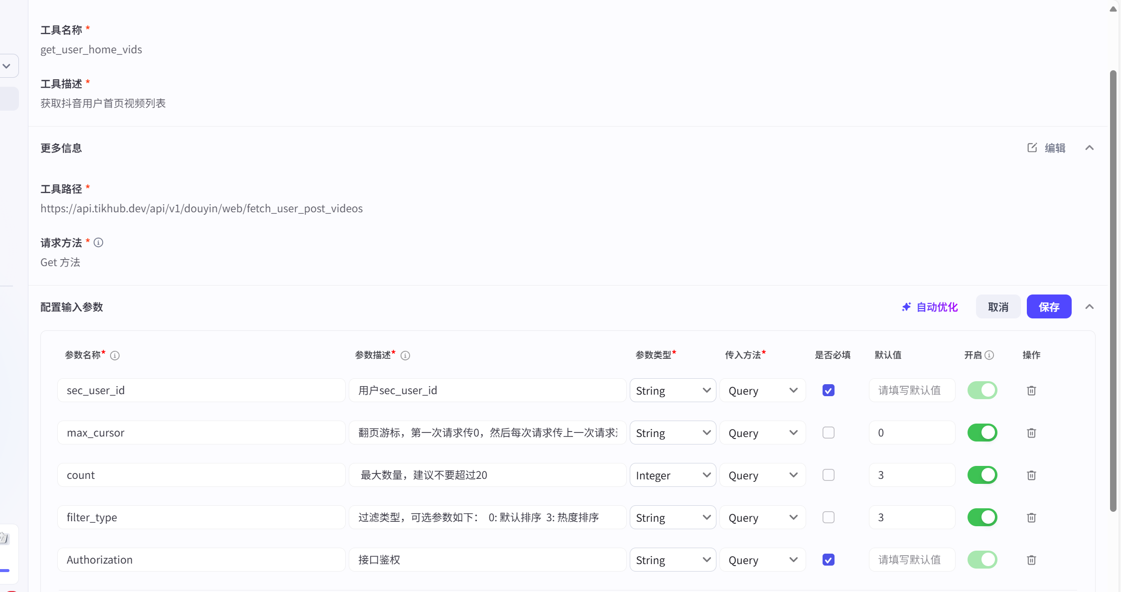7.我们切换到coze平台,名字下方的get为接口详细,编辑工具路径,将他黏贴在后边。然后切换请求方法为get方法,并且将配置输入参数帖上,最后效果如下。