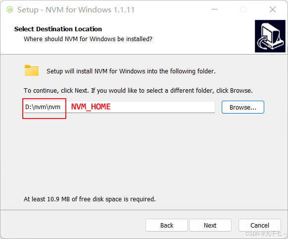 然后运行下载好的 nvm-setup.exe 文件。按图片中路径配置