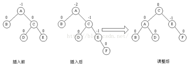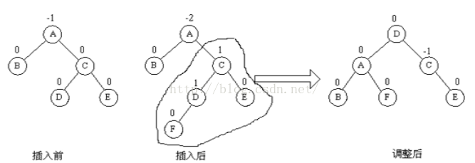 由于在A的右子树C的右子树插入了结点F,A的平衡因子由-1变为-2,成为不平衡的最小二叉树根结点。此时,A结点逆时针左旋转,遵循“旋转优先”的规则,A结点替换D结点成为C的左子树,D结点成为A的右子树。
