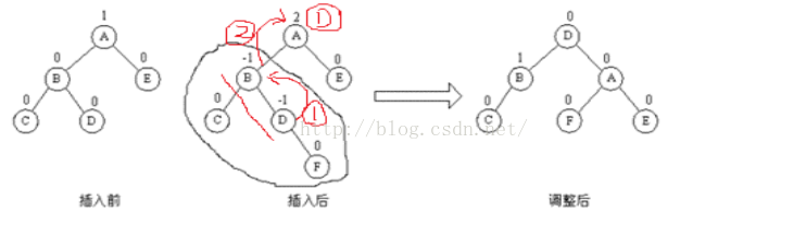 由于在A的左子树B的右子树上插入了结点F,A的平衡因子由1变为了2,成为不平衡的最小二叉树根结点。第一次旋转A结点不动,先将B的右子树的根结点D向左上旋转提升到B结点的位置,然后再把该D结点向右上旋转提升到A结点的位置。