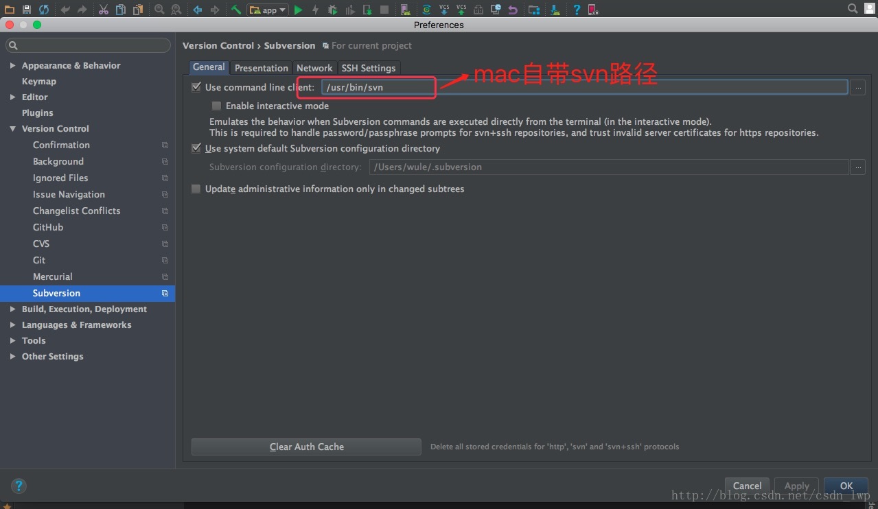mac svn需要自行下载,或者如果你安装了xcode会自带command line tools这个插件,百度搜索command line tools,进行下载安装,安装后进行下图配置即可。