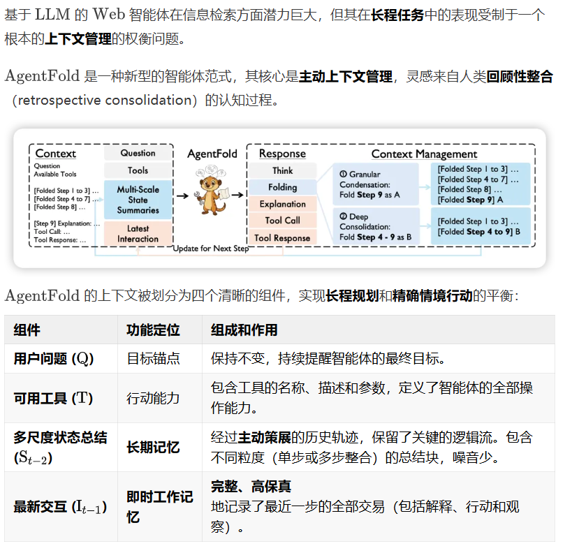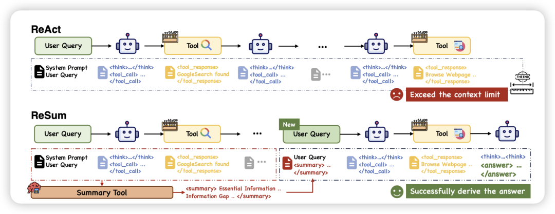 | ReSum 范式 | 定期 调用摘要工具,将不断增长的交互历史转化为紧凑的推理状态(结构化摘要),并从摘要状态恢复推理。 | 绕过上下文约束 ,实现长程、无限制的探索。 |