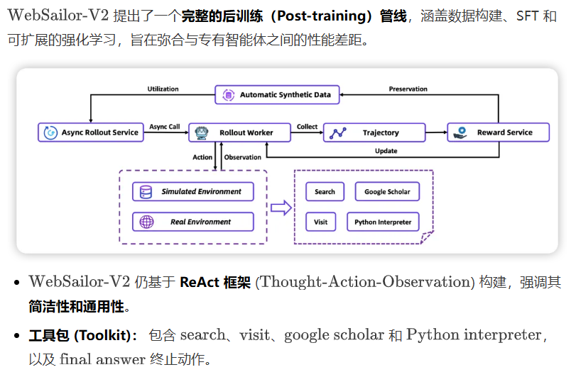 WebSailor 提出了一个完整的后训练(post-training)方法论,旨在将这种超人级的复杂推理能力植入到开源智能体中: