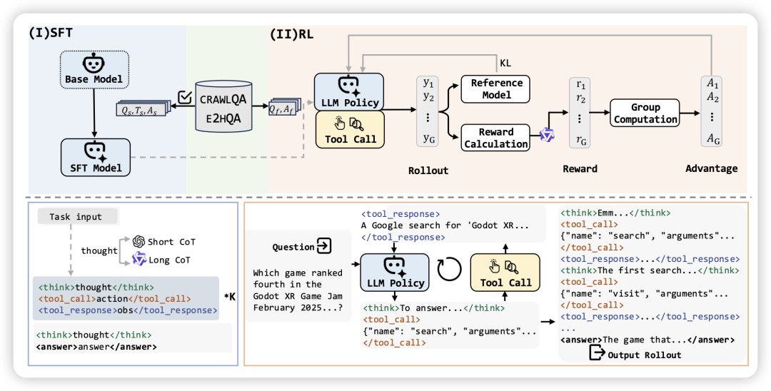 推理轨迹重建: 利用强大的 LRM 专家生成行动-观察轨迹,然后重建简洁、面向行动的推理(Thought),作为高质量的 SFT 监督信号。