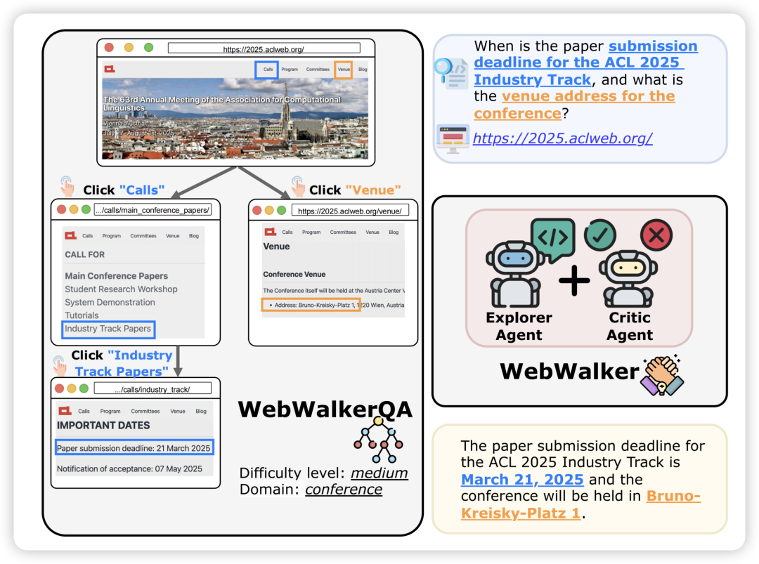 WebWalkerQA 是一个用于评估LLMs网络遍历能力的具有挑战性的基准。WebWalker 作为一个多智能体框架,有效地模仿了人类的网络导航。实验证明,将 RAG 与 WebWalker 结合,能显著提高网络导航任务的性能。这项工作强调了在基于网络的任务中进行深度、垂直探索的重要性。