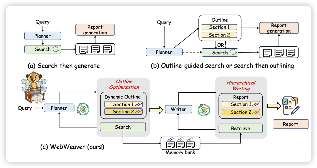 多数方法遵循静态研究管道,将规划(大纲)与证据获取(搜索)解耦,例如:“先搜索后生成”或“先静态大纲后搜索”。这导致大纲基于过时的内部知识或受限于初次搜索范围,缺乏适应性。WebWeaver 引入了一种双智能体框架,模仿人类研究过程,以解决上述挑战。