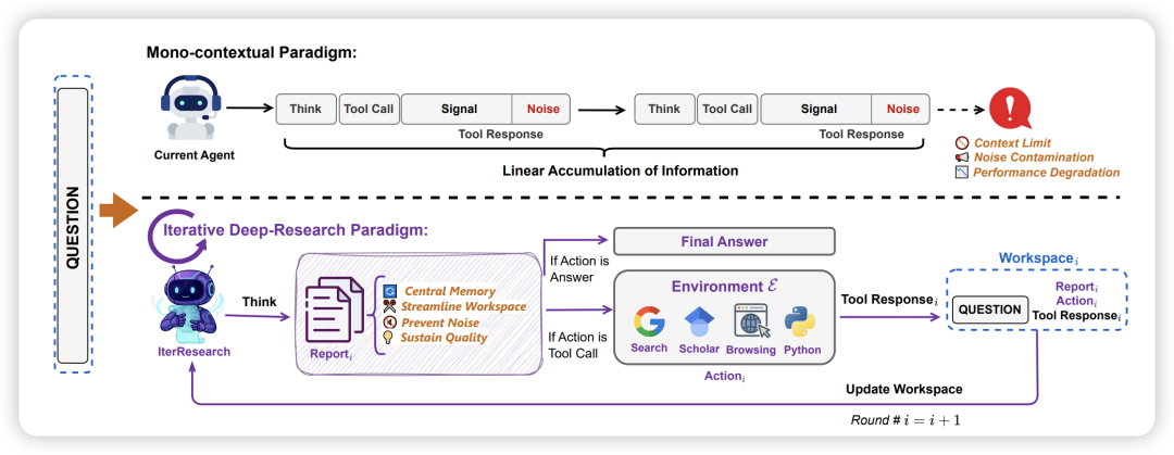 | IterResearch | 迭代深度研究范式 ,将深度研究重新表述为马尔可夫决策过程(MDP)。 | 通过周期性报告整合和工作空间重构,实现无界的研究深度和持续的高质量推理。 |