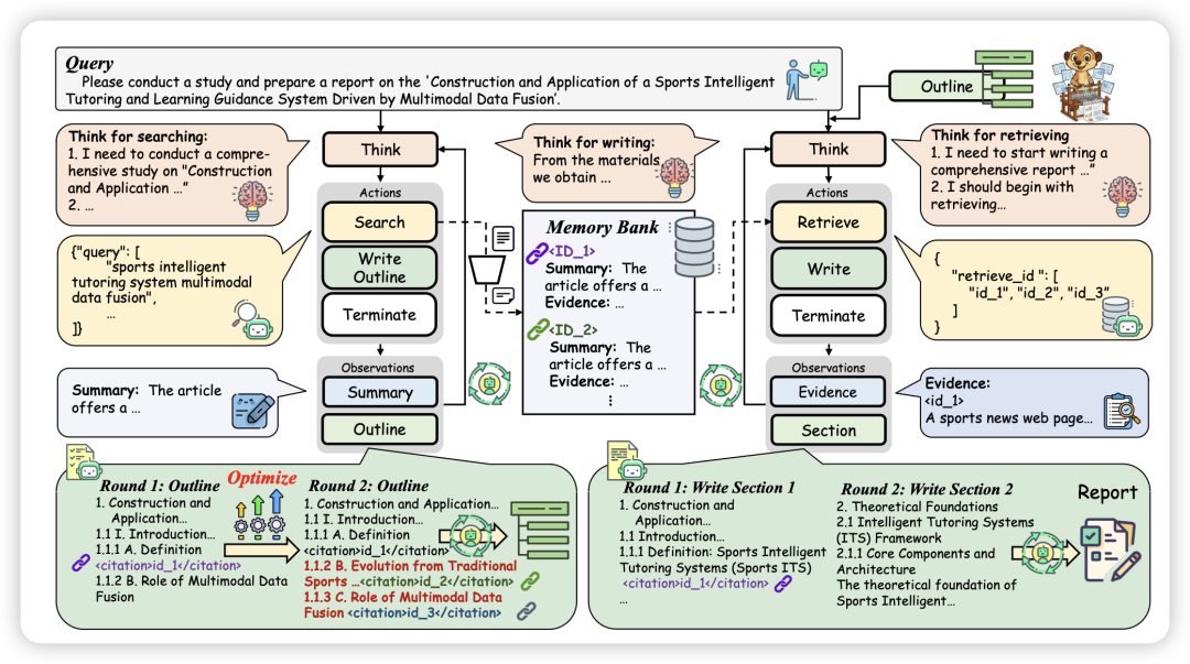| Writer (撰写者) | 分层检索与写作 :逐节撰写报告,通过大纲中的引用,从记忆库中精准检索仅需的证据。 | 解决了长上下文问题、注意力分散和引用幻觉,确保证据可靠性和报告结构。 |