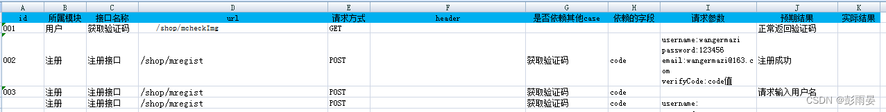 * id 所属模块 接口名称 接口地址 请求方式 header 是否依赖 请求参数 预期结果 实际结果