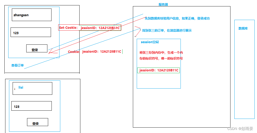 在WEB开发中,服务器可以为每个用户浏览器创建一个会话对象(session对象),注意:一个浏览器独占一个session对象(默认情况下)。因此,在需要保存用户数据时,服务器程序可以把用户数据写到用户浏览器独占的session中,当用户使用浏览器访问其它程序时,其它程序可以从用户的session中取出该用户的数据,为用户服务。
