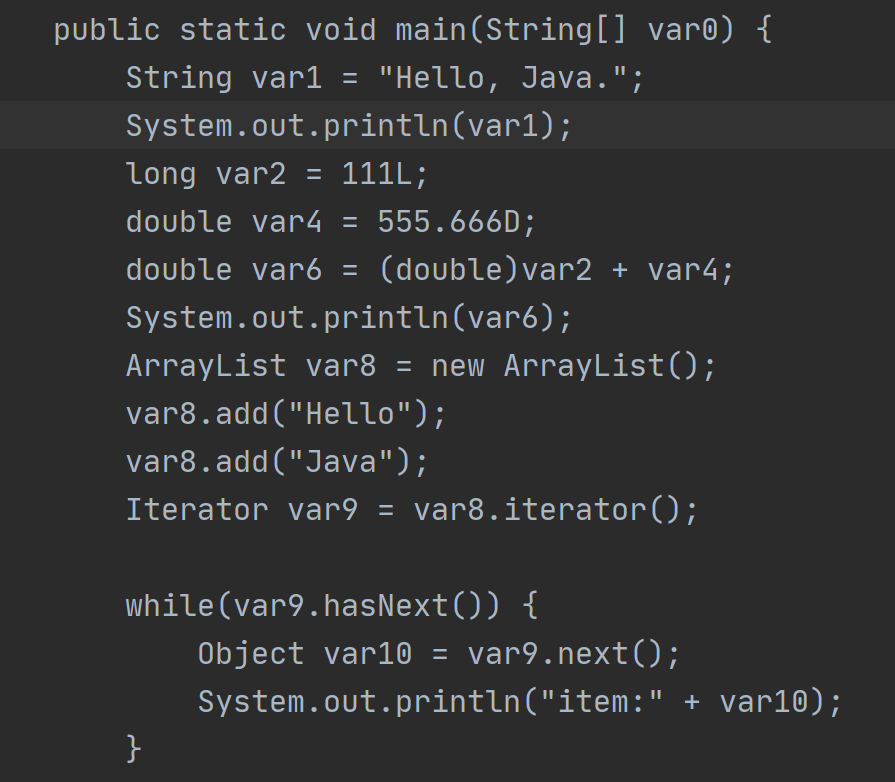 然后我们再用反编译工具打开被编译的类发现:var 竟然被替换成一个个确定的数据类型了,如下图所示: