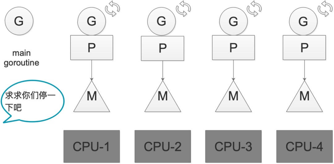 假设在 demo-1 中,共有 4 个 P,于是创建了 4 个 goroutine。当主 goroutine 执行 sleep 的时候,刚刚创建的 4 个 goroutine 马上就把 4 个 P 霸占了,执行死循环,而且竟然没有进行函数调用,就只有一个简单的赋值语句。Go 1.13 对这种情况是无能为力的,没有任何办法让这些 goroutine 停下来,进程对外表现出“死机”。