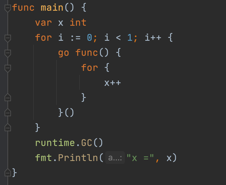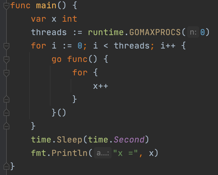 我也来解释一下,在主 goroutine 里,只启动了一个 goroutine(虽然程序里用了一个 for 循环,但其实只循环了一次,完全是为了和前面的 demo 看起来更协调一些),同样执行了一个 x++ 的无限 for 循环。