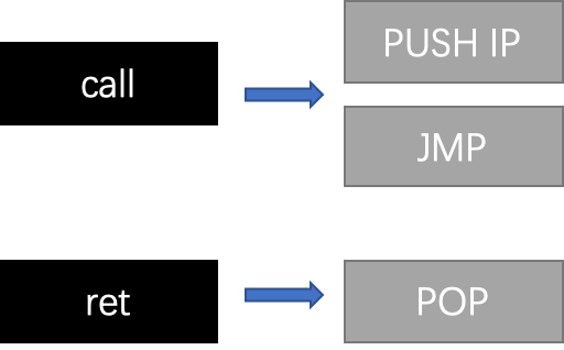 call 指令可以简单地理解为 push ip + JMP。这个 ip 其实就是返回地址,也就是调用完子函数接下来该执行啥指令的地址。所以 push ip 就是在 call 一个子函数之前,将返回地址压入栈中,然后 JMP 到子函数的地址执行。