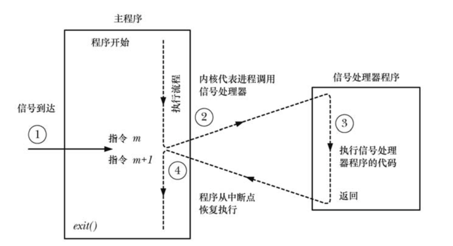 主程序(线程)正在“勤勤恳恳”地执行指令:它已经执行完了指令 m,接着就要执行指令 m+1 了……不幸在这个时候发生了,线程收到了一个信号,对应图中的 ①。