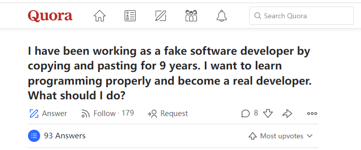 更有甚者,直接提出了:“我已经通过复制和粘贴做了9年的假软件开发人员。我想好好学习编程,成为一个真正的开发者。我应该怎么做?”