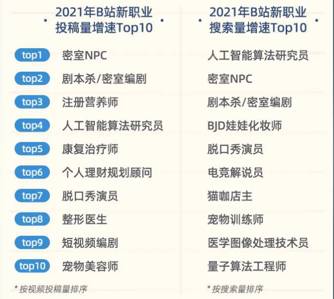 在“2021年新职业投稿量增速Top10”榜单中,密室NPC、剧本杀/密室编剧和注册营养师分别成为增速最快的前三名。而在搜索量增速榜单中,人工智能算法研究员成了排名第一的职位。