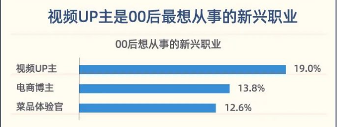 此外,UP主职业化成为新趋势。在00后最想从事的新兴职业调研中,视频UP主以19%的得票数排名第一,其次是电商博主和菜品体验官。
