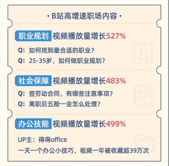 与此同时,职业规划、社会保障、办公技能等视频成为B站高增速职场内容。这也说明当代青年有较强的自我驱动力,在求职时更关注“个人成长”与“社会保障”。