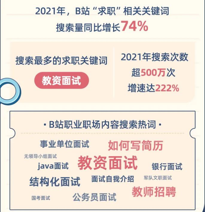 报告显示,2021年,“求职”相关关键词搜索量同比增长74%。其中搜索最多的关键词是「教资面试」,2021年的搜索次数超500万次,增速达222%。