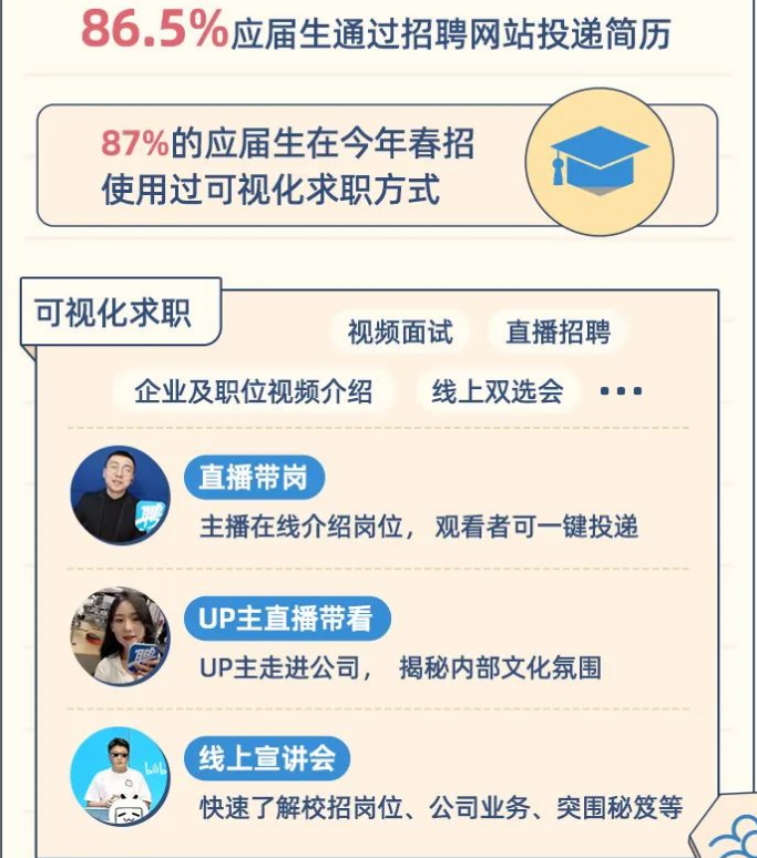 数据显示,有86.5%的应届生通过招聘网站投递简历,还有87%的应届生在今年春招时使用过视频面试、直播招聘、线上双选会等可视化求职方式。其中,直播带岗、UP主直播带看公司和线上宣讲会等方式备受求职者关注。