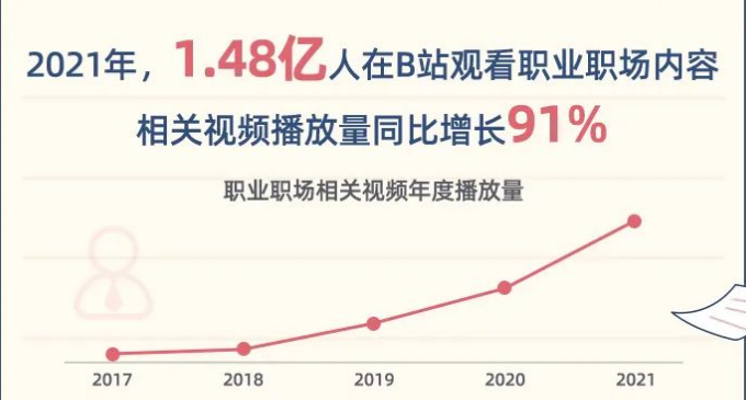 近年来,通过视频传播知识已然成为了新趋势。2021年,有1.48亿人观看职业职场内容,相关视频播放量同比增长91%。