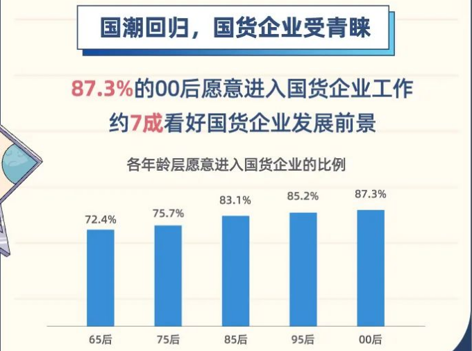 随着国潮的回归,相比前辈,00后在就业选择上更加青睐国货企业。其中,87.3%的00后愿意进入国货企业工作,约7成看好国货企业发展前景。