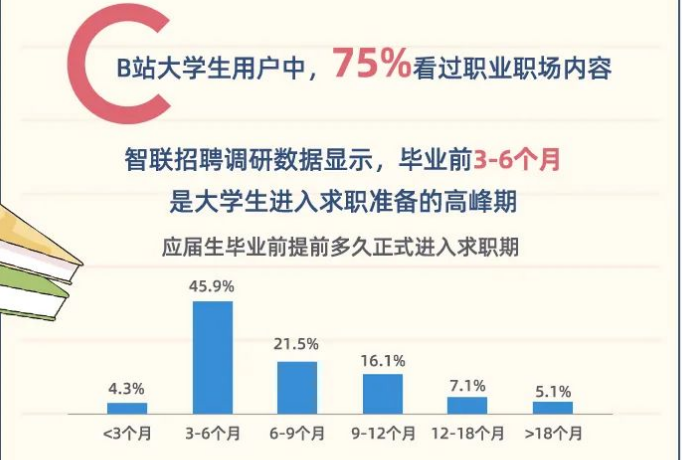 同样,职场内容也成为了大学生的“必修课”。在大学生用户中,75%看过职业职场内容。调研数据显示,毕业前3-6个月是大学生进入求职准备的高峰期。