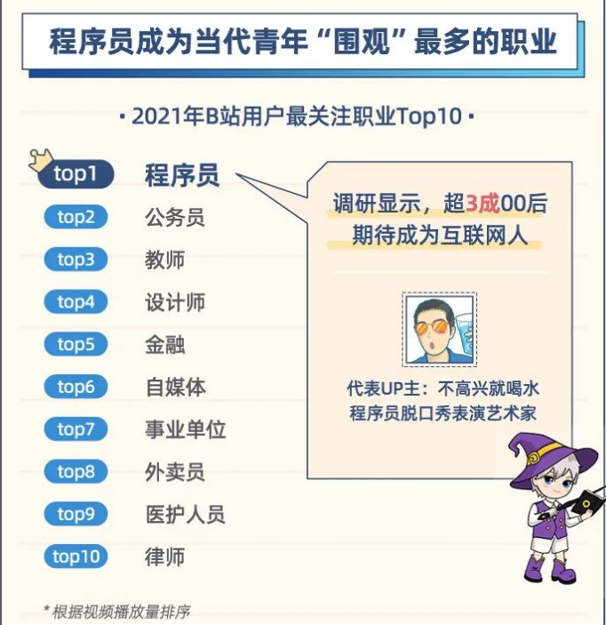 在“2021年用户最关注职业Top10”榜单中,程序员成为当代青年“围观”最多的职位。调研显示,超3成00后期待成为互联网人,其次为公务员和教师。