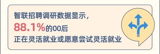 随着00后就业观念的改变,他们不再拘泥于进入所谓“企业”、“单位”,而是选择拥抱更加多样化的就业方式。调研数据显示,88.1%的00后正在灵活就业或愿意尝试灵活就业。
