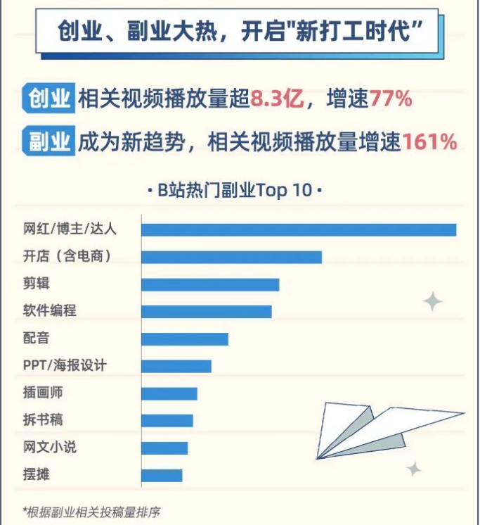 据统计,创业类相关视频播放量超8.3亿,增速77%;副业成为新趋势,相关视频播放量增速161%。其中网红/博主/达人、开店、剪辑、软件编程和配音等副业的视频投稿最多。