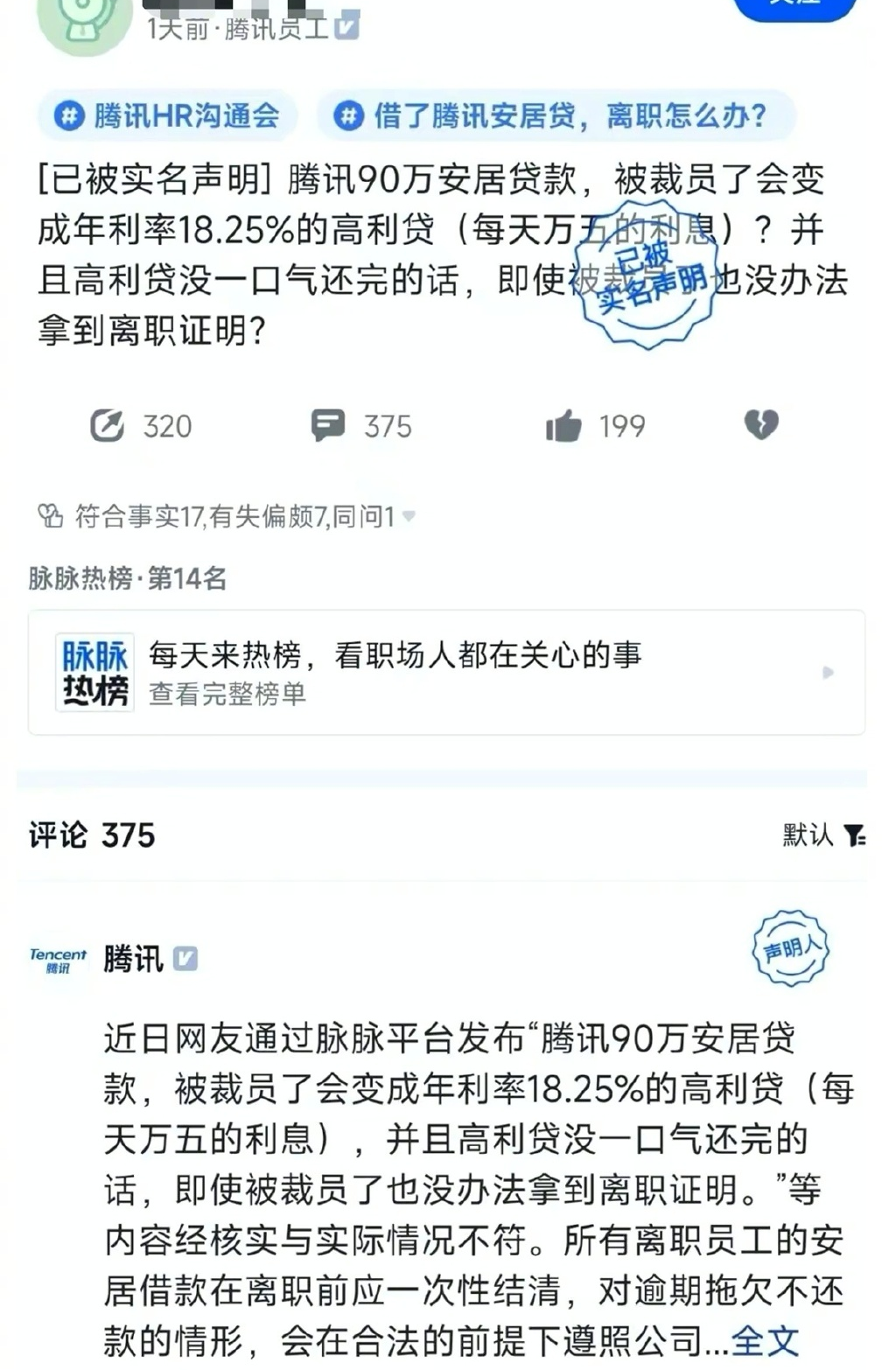 一位认证为腾讯员工的脉脉网友称,腾讯90万安居贷款,被裁员了会变成年利率18.25%的高利贷(每天万五的利息),并且高利贷没一口气还完的话,即使被裁员了也没办法拿到离职证明。(后纠正为年化36.5%,每天万十的违约金)