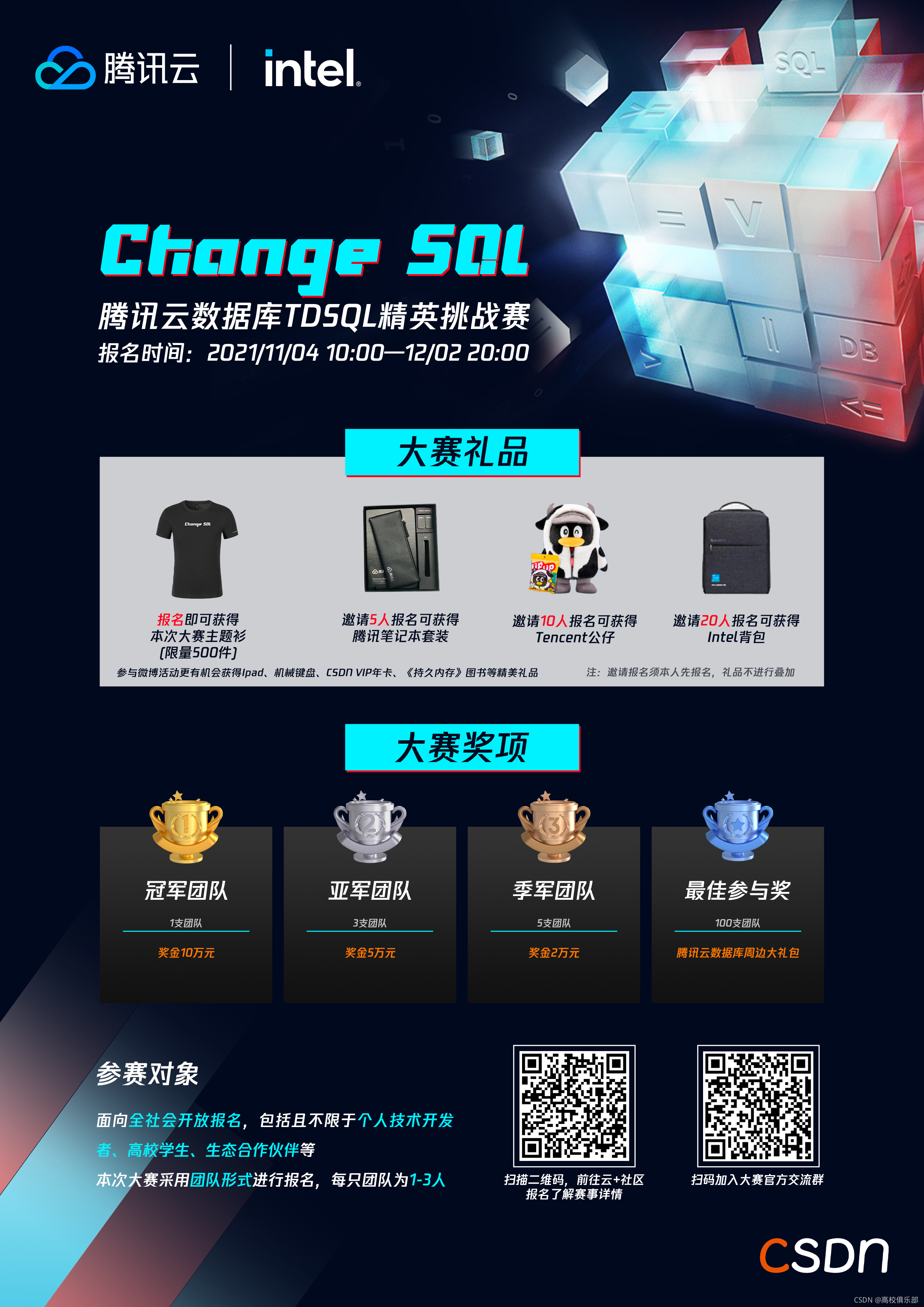 Change SQL-腾讯云数据库TDSQL精英挑战赛来了! 超35万奖金池+腾讯面试绿卡等你来拿 请扫描二维码,前往云+社区报名了解赛事详情,报名参赛 Change SQL Change SQL-腾讯云数据库TDSQL精英挑战赛来了!