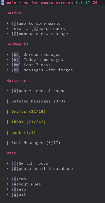 启动spacemacs后,按下M-m a M, 看到如下mu4e界面