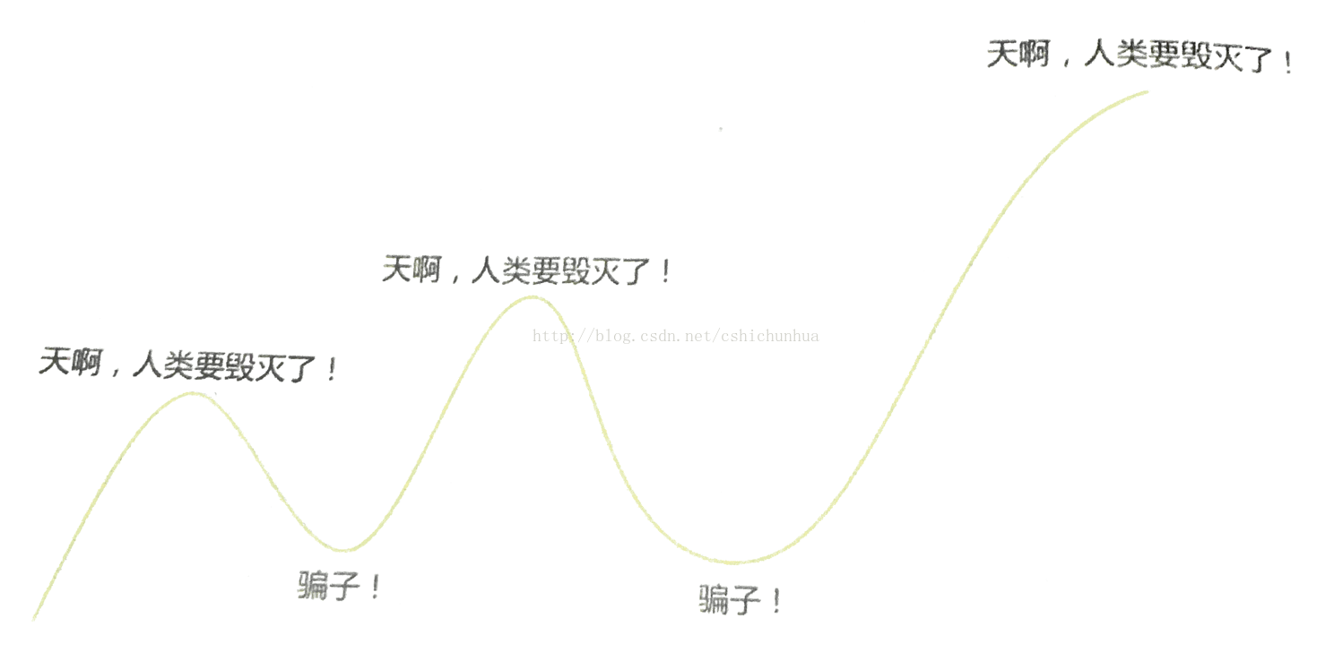 和前面那张高效的“人工智能发展成熟度曲线”不同,学术界、产业界和投资界在谈到技术高潮与低谷时,经常会引用高德纳咨询公司(Gartner)推荐的技术成熟度曲线。