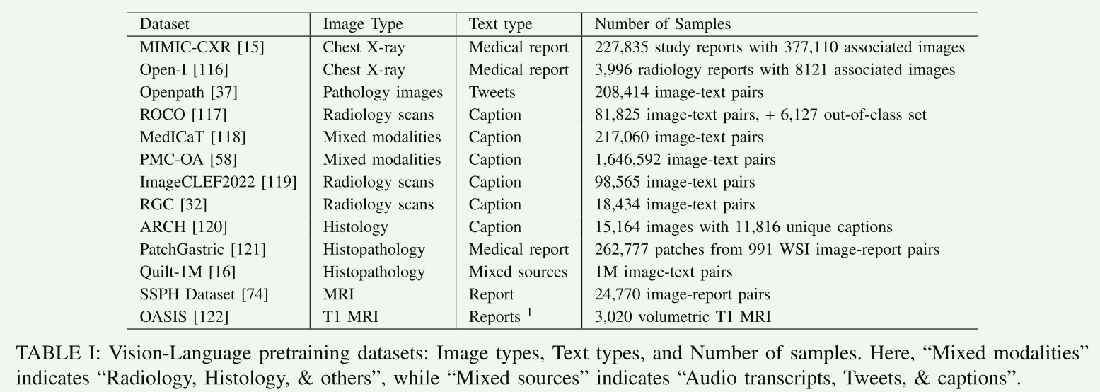 预训练数据集是用于训练医学VLP模型的基础,包括大量医学图像和对应的文本数据。一些主要的预训练数据集包括: