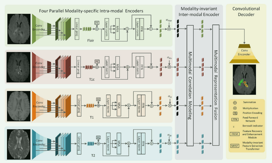 特征融合和分割:模态不变的内部模态编码器融合来自不同模态的特征,卷积解码器则利用这些融合的特征进行图像重建和肿瘤分割