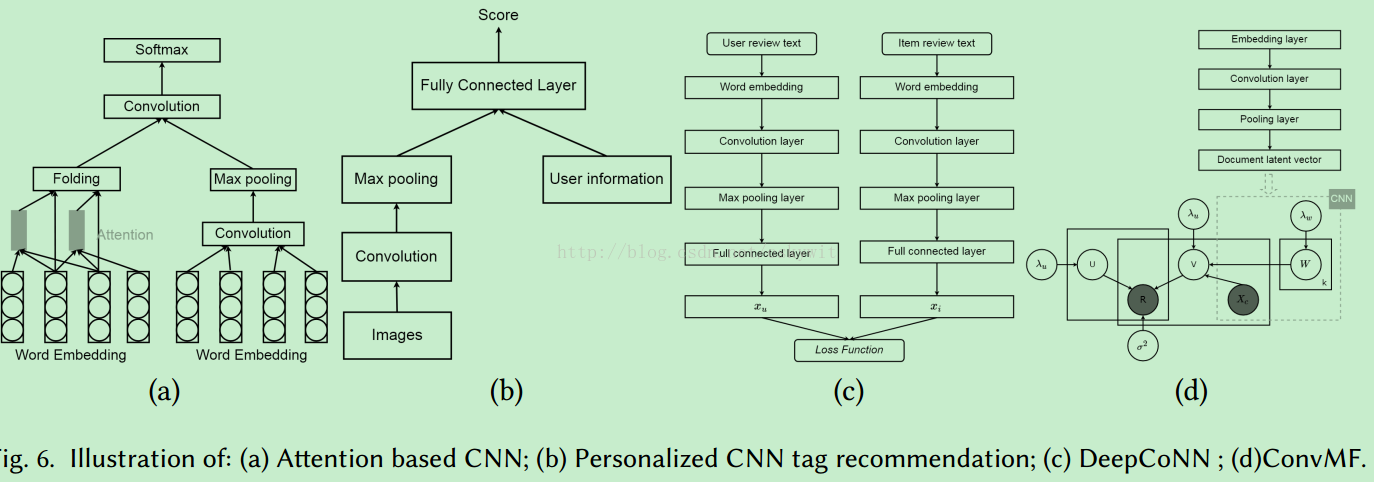 3. 本文按照仅仅使用深度学习的推荐系统和混合使用多种技术的推荐系统进行分来阐述。在仅仅基于深度模型的推荐系统中,MLP可以很容易地对用户和项目之间的非线性交互进行建模;CNN能够从异构数据源,如文本和视觉信息提取局部和全局表示。RNN 能够对用户动态的评分数据、内容信息的序列影响进行建模,DSSM能够执行用户和项目之间的语义匹配。