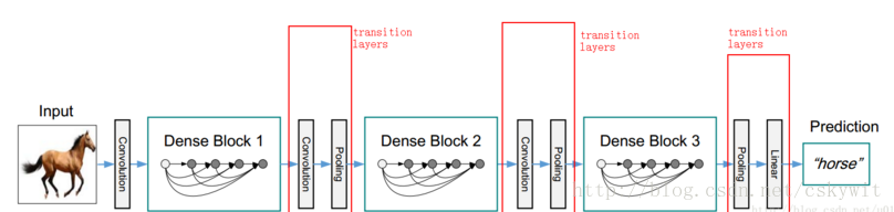 在dense连接时,为了解决特征图尺寸不一致问题,将网络划分为多个dense block。同时在不同的dense block之间增加transition layers(BN,1*1Conv)