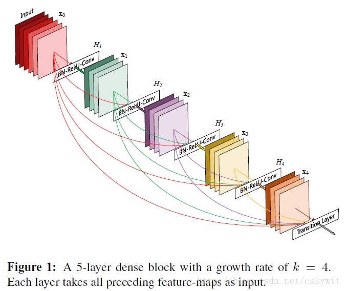 由于dense连接,特征图数量增加,为了控制数据量,定义了Growth Rate,如上图K=4,所有四个特征图。