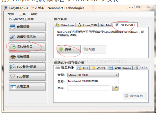 打开EasyBCD,添加新条目-》NeoGrub -》安装: