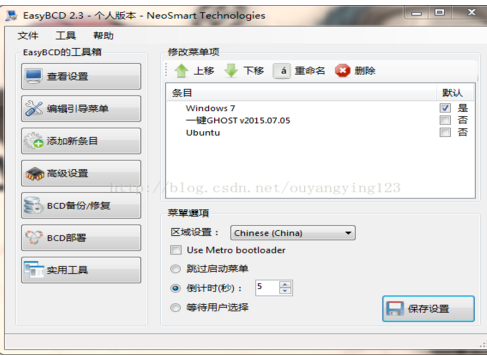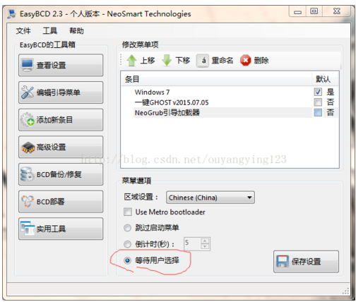 在EasyBCD 编辑引导菜单可看到NeoGrub引导加载器,记得勾选等待用户选择,保存设置: