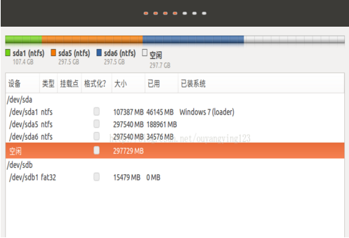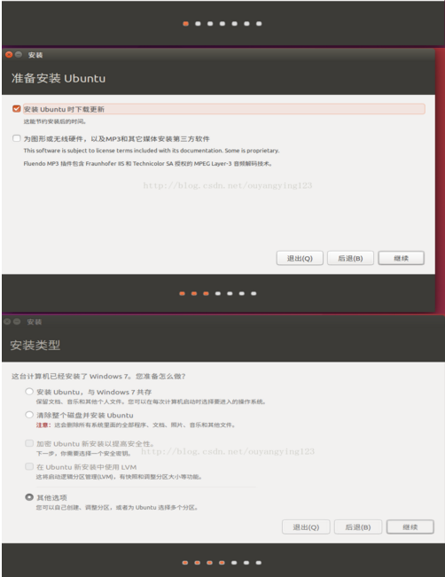 安装类型对于初学者可以使用“安装Ubuntu,与Win7共存”,这种方式优点是不用考虑分区问题,缺点是Windows与Ubuntu文件混在一起,不便于日后卸载Linux。